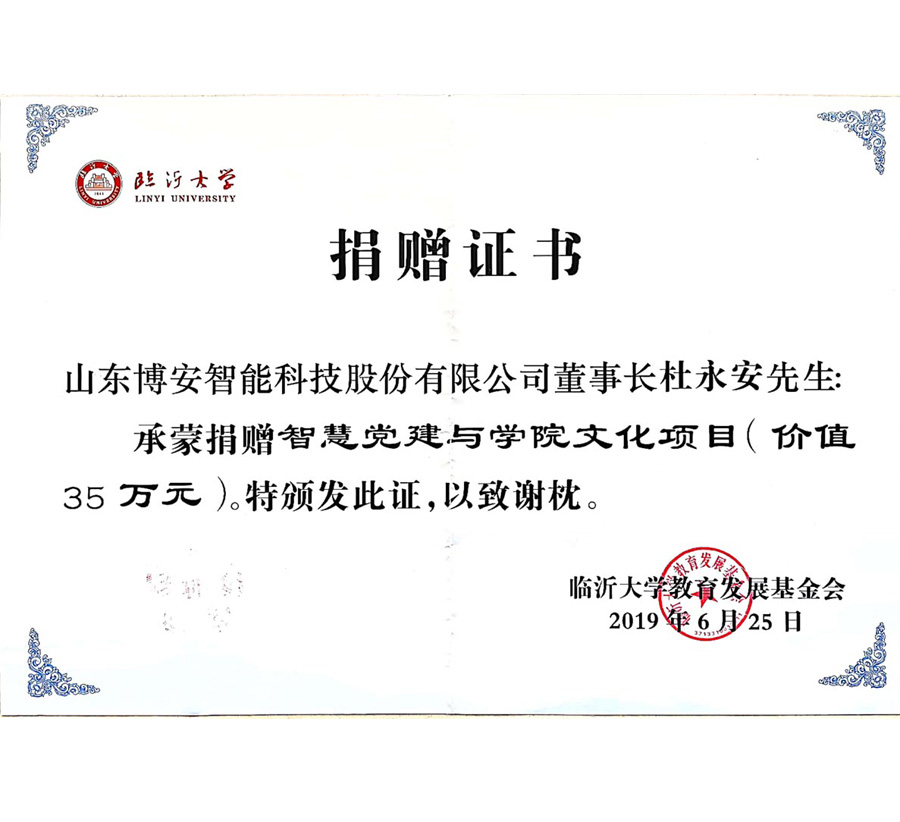 2019临沂大学捐赠证书-智慧党建与学院文化项目35万元设备