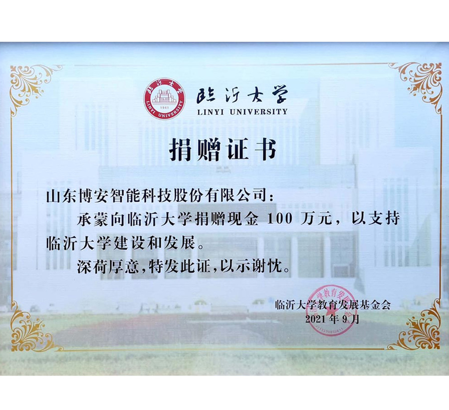 2021临沂大学捐赠证书-100万