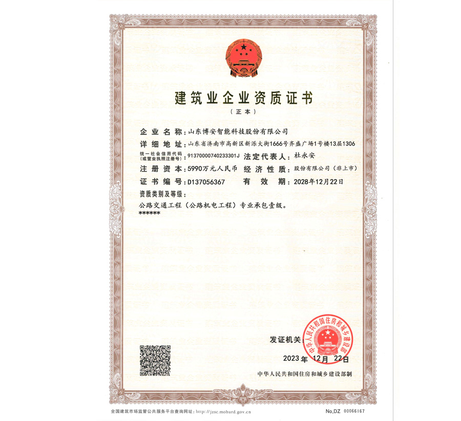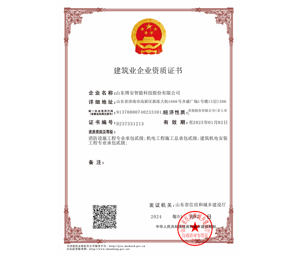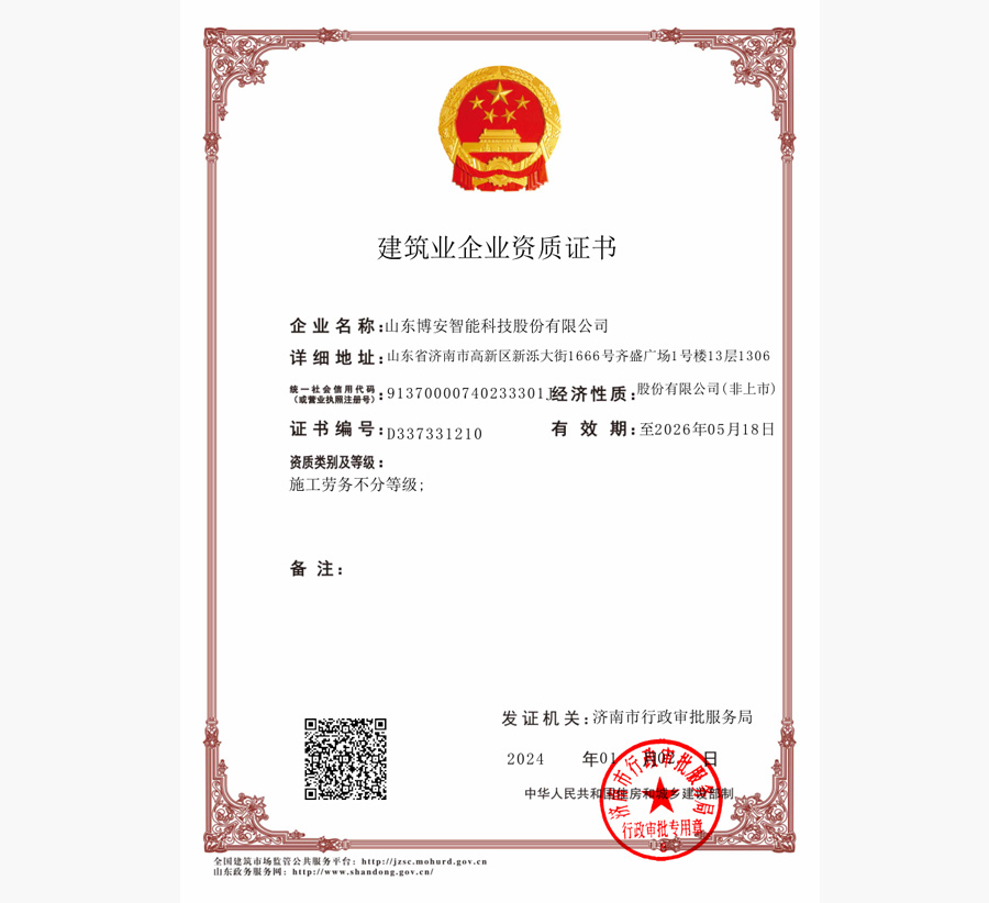 山东省安全技术防范工程设计施工维护等级确认登记证壹级